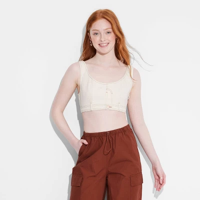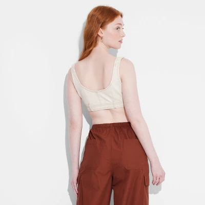 Reworked denim tiny vest from Wild Fable™ accented with contrast stitching. Tailored in a slim fit with an at-midriff length. Features a scoop neck and a belt-loop waistband with a front button. Made of cotton-rich fabric with a hint of spandex for comfortable wear that moves with you.